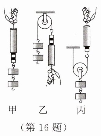 16. 如图所示的是小海同学研究定滑轮和动滑轮特点的实验装置。实验时匀速拉动弹簧测力计,测得的数据如下表所示。