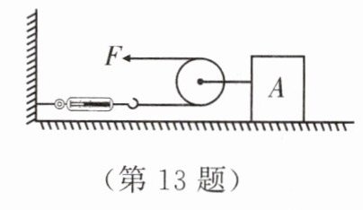 13. 如图所示,物体 A 以 2 m/s 的速度在水平地面上做匀速直线运动,此时弹簧测力计的示数为 3 N。则水平拉力 F 为_______N;物体 A 受到的摩擦力 f 为_______N;2 s 内拉力 F 做的功为_______J。(滑轮的重力、弹簧测力计的重力以及滑轮与绳间的摩擦均不计)