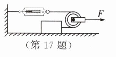 17. 如图所示,物体重 100 N,在力 F 的作用下以 5 cm/s 的速度水平向右运动,此时弹簧测力计的示数为 10 N,则物体受到的摩擦力是__________N,拉力 F 为__________N;拉力 F 在 10 s 内做功的功率是__________W。(不计绳与滑轮间的摩擦、绳重和滑轮重)