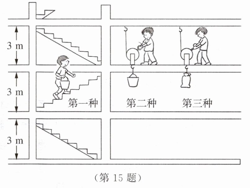 15.要把重为100 N的沙子运上三楼,有如图所示的三种办法。第一种:直接用手拎着装沙子的沙桶上楼;第二种:使用动滑轮将装沙子的沙桶运上楼;第三种:用动滑轮将装沙子的沙袋运上楼。其中,人的体重为100 N,动滑轮重为10 N,装沙的桶重20 N,装沙的袋子重5 N。其中办法最好的是________,原因是______________________________。