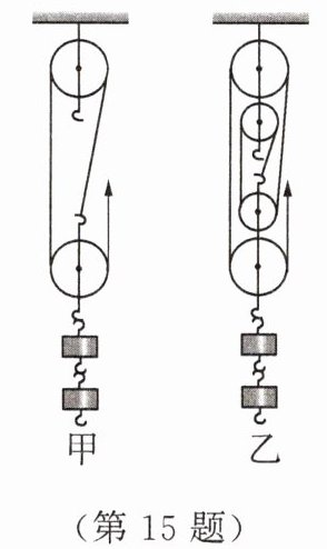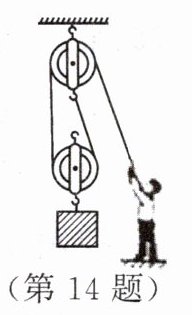 14. 小坤家新买的房子距地面12 m,装修时为了节省人工、加快进度,工人用如图所示的滑轮组来提升装修材料。工人站在地面上用1 min匀速把100 kg的水泥吊到了楼上,所用的拉力是625 N。求此过程中工人做功的功率和滑轮组的机械效率。(g取10 N/kg)