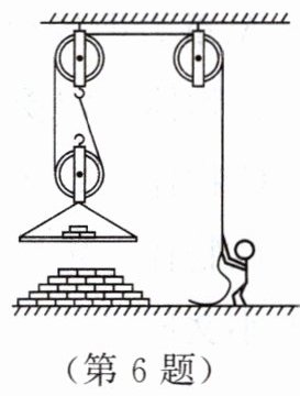 6. 工人用如图所示的装置提升砖块。已知每块砖重$40\ N$,工人的质量为$70\ kg$,他的双脚与水平地面的总接触面积为$400\ cm^{2}$(不计绳重和摩擦)。当工人匀速提升$20$块砖时,此装置的机械效率为$80\%$,则工人对水平地面的压强为______$Pa$。在此过程中,砖块上升的速度是$0.2\ m/s$,则工人做功的功率是______$W$。当工人用此装置提升______块砖时,该装置的机械效率最高。($g$取$10\ N/kg$)