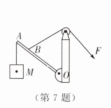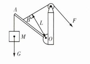 7. 如图所示的是一个杠杆式简易起吊机,它上面装了一个定滑轮用来改变拉绳的方向,杠杆$OBA$可绕$O$点转动。请在图中画出杠杆$OBA$的动力臂$L$和物体$M$所受重力的示意图。