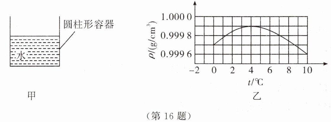 16. 如图甲所示,圆柱形容器中装有一定质量的水,水温从 0 ℃上升至 10 ℃过程中,水的密度与水温的关系图像如图乙所示。由图可判断,该过程中,水的体积________________(填“先变大后变小”、“先变小后变大”或“一直保持不变”),水在_______℃左右时密度最大。(忽略水的蒸发)