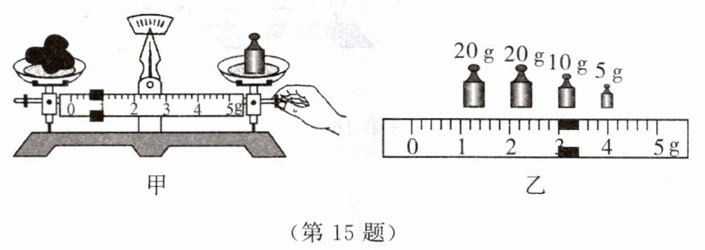 (2)改正错误后,小花同学重新进行测量。调节天平平衡后,她将小石块放在天平的右盘并通过在左盘增减砝码和移动游码使天平再次平衡,砝码的质量和游码的位置如图乙所示。记录好数据后小花立刻发现自己的操作是错误的,但是也可以通过这种测量方法计算出小石块的质量,则小石块的质量为 ____________$g$。