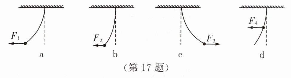 17. 小张同学做了一个实验来验证力的三要素对力的作用效果的影响,如图所示,用力 F₁、F₂、F₃、F₄ 分别拉一根锯条,使其发生图中 a、b、c、d 四种形变,其中 F₁ = F₃ = F₄>F₂,力 F₃ 与其他三个力的方向相反。