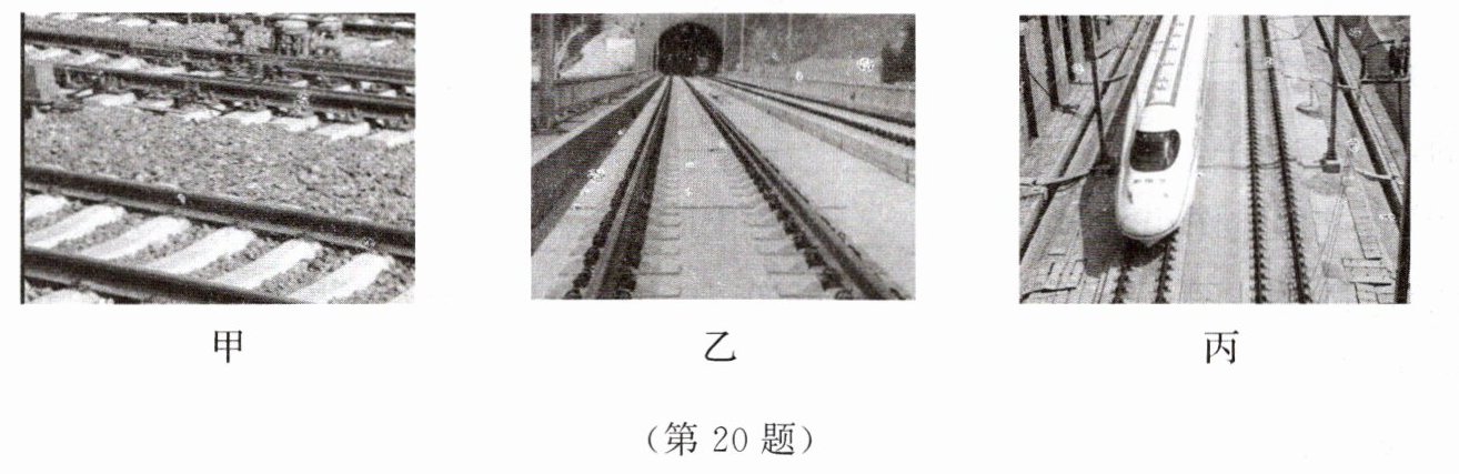 传统铁路的钢轨固定在枕木上,枕木下为用小碎石铺成的路砟(如图甲)。无砟轨道(如图乙)的路基不用碎石,铁轨和轨枕直接铺在混凝土上,这样可减少维护、降低粉尘等。高速列车在无砟轨道上运行时如子弹头般穿梭而过,时速可达 350 km(如图丙)。