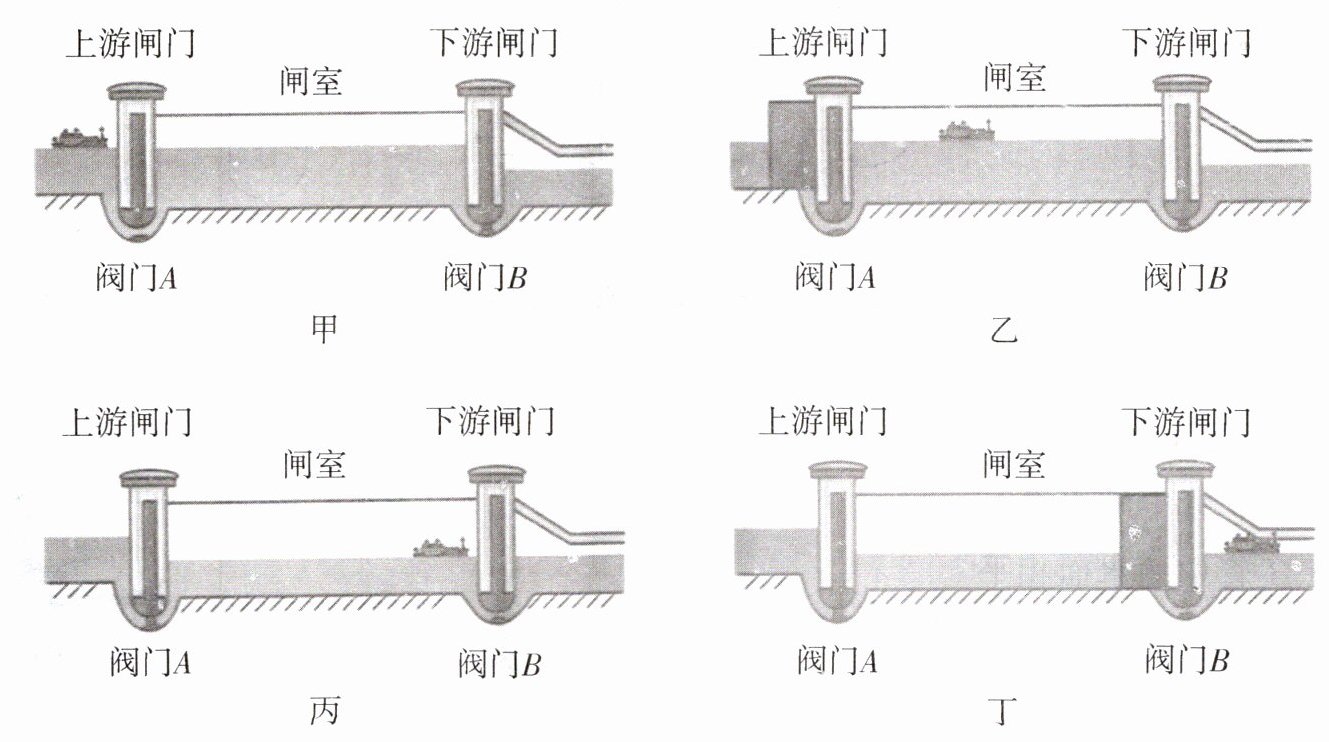 3. 如图所示的为船从上游通过船闸驶往下游的过程。①如图甲所示,船从上游驶来,_______(填“打开”或“关闭”)上、下游闸门和阀门B,_______(填“打开”或“关闭”)阀门A,使上游水道和闸室形成一个_______。上游的水通过阀门_______进入闸室。②如图乙所示,当水停止流动时,上游水道和闸室中的水面_______。打开上游闸门,船从上游驶入闸室。③如图丙所示,_______(填“打开”或“关闭”)上游闸门和阀门A,_______(填“打开”或“关闭”)阀门B,使闸室和下游水道形成一个_______。闸室内的水通过阀门B流到下游。④如图丁所示,当水停止流动时,闸室和下游水道的水面_______。打开下游闸门,船从闸室驶向下游。