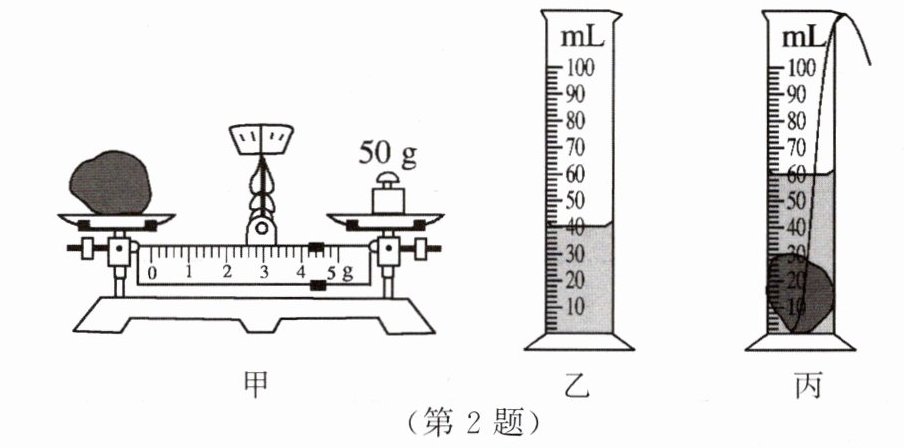 2.小华称量一块石头的质量,天平平衡时,所用砝码的质量和游码的位置如图甲所示,由此可知石头的质量为_______g。他再用量筒测量石头的体积,放入石头前、后量筒中水面的高度如图乙、丙所示,则石头的体积为_______cm³,由此可求得石头的密度为_______kg/m³。