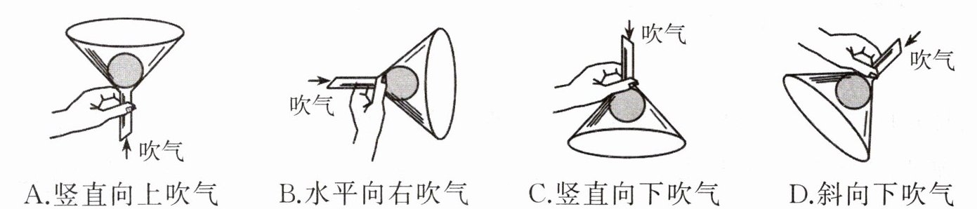 10. 小明用“向漏斗口吹气,观察乒乓球状态”的方法来探究流速对流体压强的影响。下列方案不合理的是 ( )