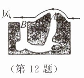 12. 如图所示的是犬鼠洞穴的横截面示意图。它有两个出口,当风吹过隆起洞口 A 表面时,风速较大,吹过平坦洞口 B 表面时,风速较小,从而给洞中的犬鼠带去习习凉风。下列有关洞内风向的分析正确的是 ( )