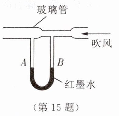 15. 如图所示的装置上方为一个粗细不均匀的两头开口的玻璃管,管下连通一个装有红墨水的 U 形管 AB。当用吹风机向玻璃管中吹风时,出现的现象是____________________。