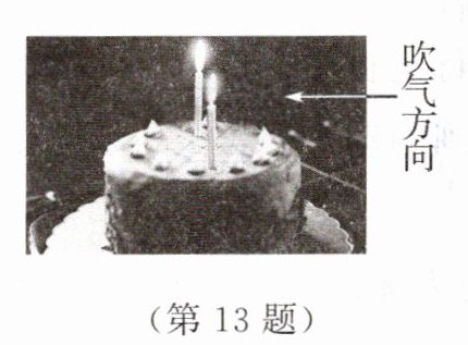 13. 小明在妈妈生日那天用自己的零花钱为妈妈买了一个蛋糕。小明点燃蜡烛,为妈妈送上祝福。如图所示,当妈妈向两支蜡烛中间吹气时,小明发现两支蜡烛的火焰__________(填火焰的运动方向),这是因为蜡烛中间的气体流速变大,压强变________。