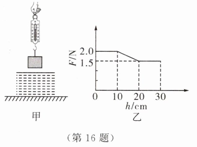 16. 如图甲所示,使圆柱缓慢下降,直至其全部没入水中,整个过程中弹簧测力计的示数 $F$ 与圆柱下降高度 $h$ 变化关系的图像如图乙所示。则圆柱受到的重力是________N,圆柱刚好全部浸没时,下表面受到水的压强是________Pa,圆柱受到的最大浮力是________N。($g$取 10 N/kg,忽略圆柱下降过程中液面高度的变化)