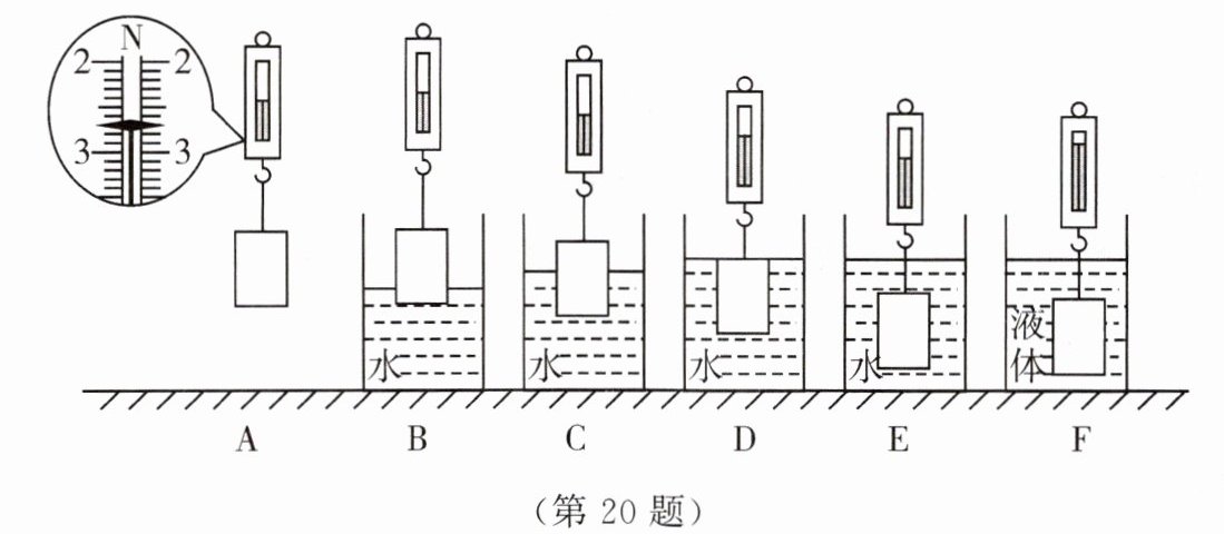 20. 在“探究浮力大小与哪些因素有关”的实验中(如图所示),小明先用弹簧测力计测出金属块的重力,然后将金属块缓慢浸入液体中的不同深度,实验步骤如图 A、B、C、D、E、F 所示(液体均未溢出),并将弹簧测力计的示数记录在表格中。