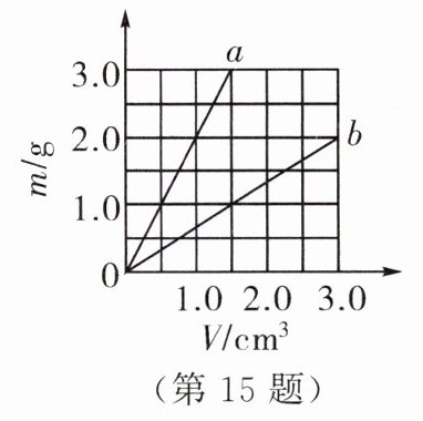 15. $a$、$b$两种物质的质量和体积的关系图像如图所示,分别用$a$、$b$两种物质制成体积相等的甲、乙两实心物体,将两物体浸没在水中,稳定后 ( )