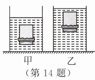14.(多选)在两个烧杯内盛有甲、乙两种液体,将瓶口扎有橡皮膜的同一小瓶,分别放入甲、乙液体中,小瓶均处于悬浮状态且开口朝下,且在甲液体中橡皮膜的凹陷程度较大,如图所示。轻触乙液体中的小瓶使其下沉。下列说法正确的是 ( )