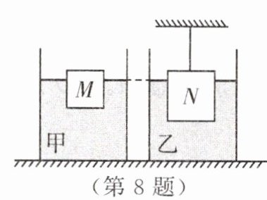 8. (多选)如图所示,水平桌面上两个相同的容器内分别装有甲、乙两种液体。$M、N$是两个质量相等的正方体,$V_{M}V_{N}$。$M$在甲液面漂浮,$N$用细线吊着静止在乙液体中(细线对$N$有拉力)。$M、N$静止时,两容器内的液面相平,$M、N$露出液面的高度相同。下列说法正确的是 ( )