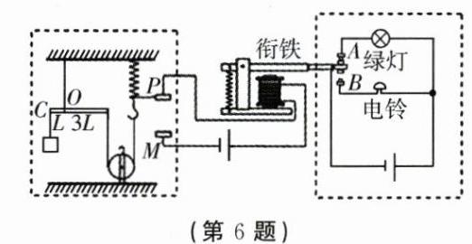 6.小雨想利用电磁继电器自制一种“超重报警器”。要求:当物重达到150 N时,电铃响,报警;反之,绿灯亮,显示正常。他找来以下器材:电磁继电器(部分电路已接好),轻质硬刻度尺、电铃、绿灯、滑轮各一个,线绳和导线若干,轻质硬弹簧一根。弹簧的一端已经固定,另一端连接触点P,弹簧的最大伸长量与触点P、M之间的距离相等,弹簧能承受的最大拉力为50 N。请利用上述器材帮小雨制作“超重报警器”,在虚线框中完成装置图,并简述工作过程。