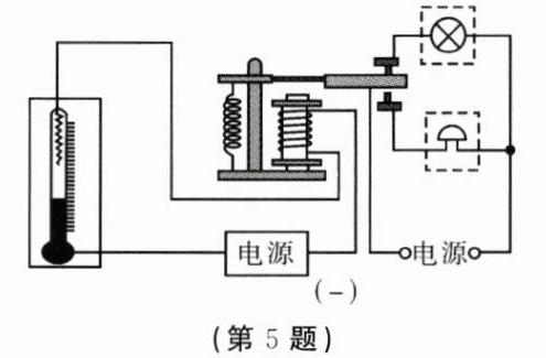5.某温度自动报警器的原理图如图所示。电磁铁上端为N极,在水银温度计中封入一段金属丝,当温度低于设定温度时,安全指示灯常亮;当温度达到设定温度时,安全指示灯熄灭,电铃发出报警信号。请在括号中标出电源的极性(用“+”或“-”表示),并在虚线框内填入电铃(⊕)和指示灯的电路元件符号。