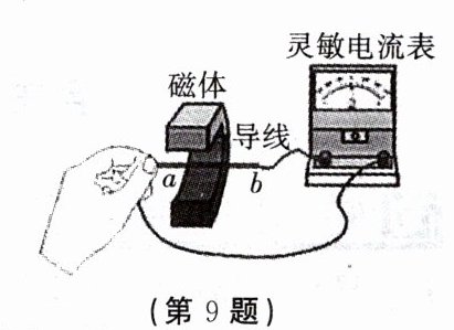9. 小明利用如图所示的装置探究“导体在磁场中产生电流的条件”,他通过观察灵敏电流表的__________来判断是否产生了感应电流。经过多次尝试,他发现,当闭合电路的一部分导体在磁场中做__________运动时,导体中就会产生感应电流。