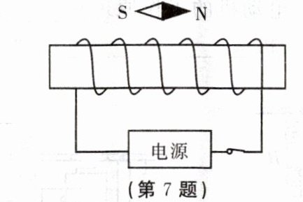 7. 小磁针在图示位置静止,请标出通电螺线管的 N 极和电源的正极。