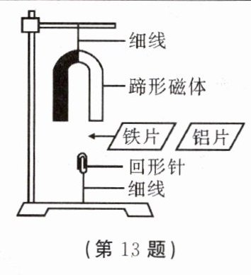 13. 磁辐射是一种环境污染,如电视机出现的“雪花”现象,飞行器的指挥信号干扰干扰,某些仪器的控制失灵等;它还会对人体危害,威胁人体健康。下列实验是人们对磁场穿透性的探究活动。用如图所示的装置探究探究,研究对象有铁片、铝片、玻璃片、木板、纸片和钢片。将这些研究对象分别置于蹄形磁体与回形针之间,探究的结果如下表。