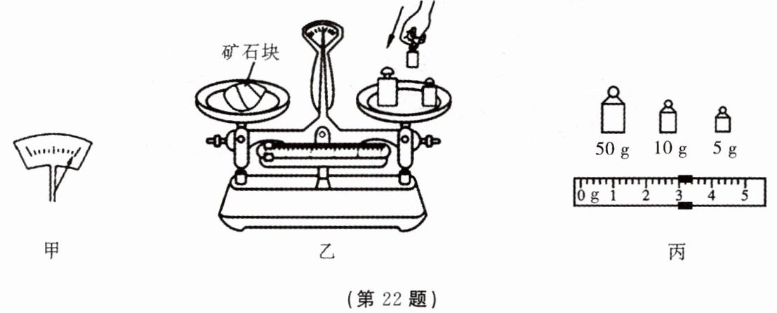 22. 某学习小组的同学想测量一种矿石的密度。现有物品和器材:矿石块、天平(含砝码)、烧杯、足量的水、细线。同学们设计了一种测量矿石密度的方案,请回答下列问题。