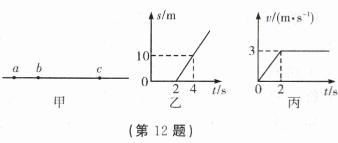 12.A、B、C三个物体分别从位于同一水平直线上的a、b、c三点开始沿该直线运动,如图甲所示,a、c之间的距离为80 m,a、b之间的距离为30 m。其中B、C两物体同时出发,物体A向右运动,其运动的s - t图像如图乙所示,物体B做匀速直线运动,物体C运动的v - t图像如图丙所示,前2 s物体C通过的路程为3 m,从开始计时10 s后,A、C相距67 m,A、B相距20 m。下列说法正确的是 ( )