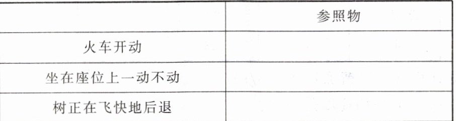 21.小明同学乘火车去旅行,火车开动后他一直坐在座位上一动不动地看着火车外的景物,他发现路旁的树正在飞快地后退。这段话中加点处的三种运动情况,各以什么为参照物?填在下面的表格中。