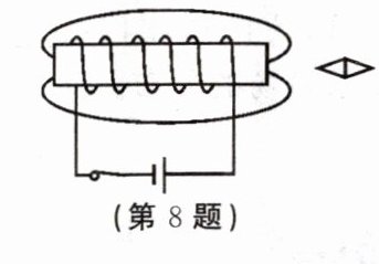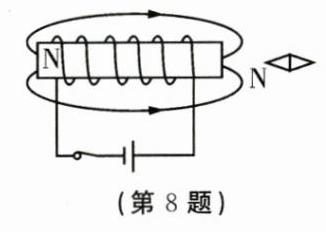 8. 如图所示,小磁针静止在通电螺线管右侧,请标出通电螺线管的N极、磁感线方向和小磁针的N极。