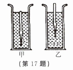 17.如图所示,把两支完全相同的密度计分别放在甲、乙两种液体中,它们所受到的浮力分别为$F_{甲}$和$F_{乙}$,则$F_{甲}$_______$F_{乙}$;若两液体深度相同,则两液体对容器底部的压强关系是$p_{甲}$_______$p_{乙}$。(均填“<”、“=”或“>”)