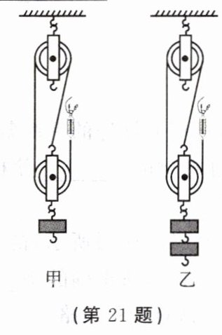 21.如图所示,某实验小组的同学用同一滑轮组分别将甲、乙两组钩码匀速提升相同高度,已知每个钩码的质量是100 g,所做的有用功分别为W₁和W₂,机械效率分别为η₁和η₂。则W₁________W₂,η₁________η₂(以上两空均填“>”、“=”或“<”)。匀速提升乙组钩码时,弹簧测力计的示数为1 N,则动滑轮重________N。(g取10 N/kg,不计绳重和摩擦)