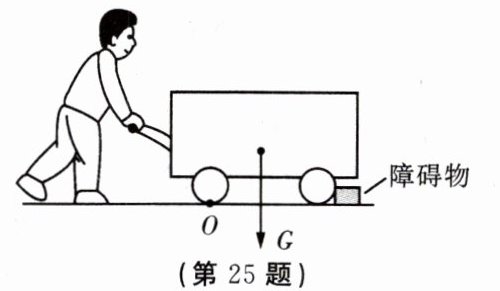 25.如图所示,火车上的售货员正推着小车售卖货物。当小车前行遇到障碍物时,需要使小车前轮翘起才能通过。请画出售货员对小车施加的最小动力F₁、动力臂L₁以及阻力臂L₂。