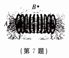 7. 在一块有机玻璃板上,安装一个用导线绕成的螺线管,在板面上均匀撒满铁屑,通电后轻敲玻璃板,铁屑的分布情况如图所示。图中A、B两点相比,______点磁场较强。实验中______(填“能”或“不能”)用铜屑代替铁屑显示磁场的分布。