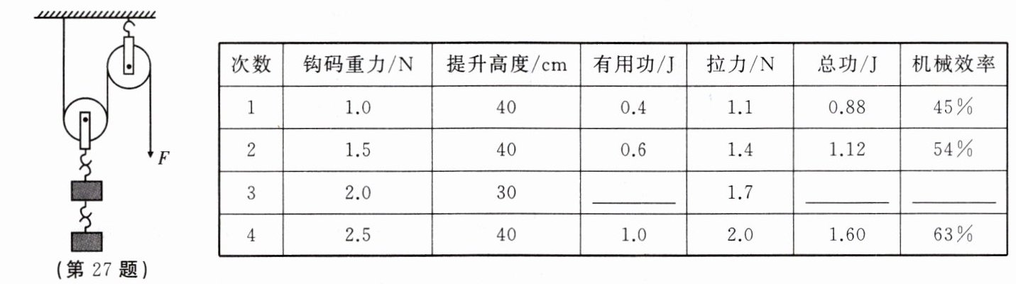 27.探究小组为探究影响滑轮组的机械效率的因素,设计的实验装置如图所示,实验记录的数据如下表所示。
