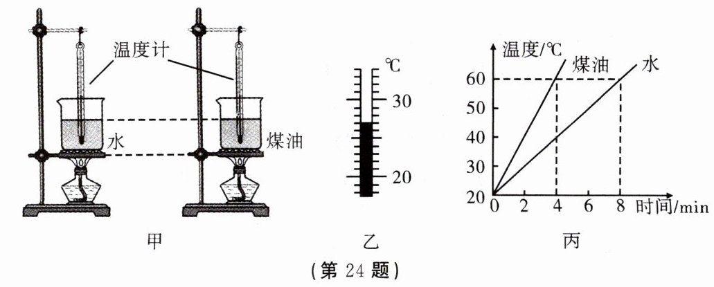 24. 在“探究不同物质的吸热情况”实验中,某同学将水和煤油分别装在两个相同的烧杯中,用两个相同的酒精灯加热,每隔 2 min 记录一次温度。