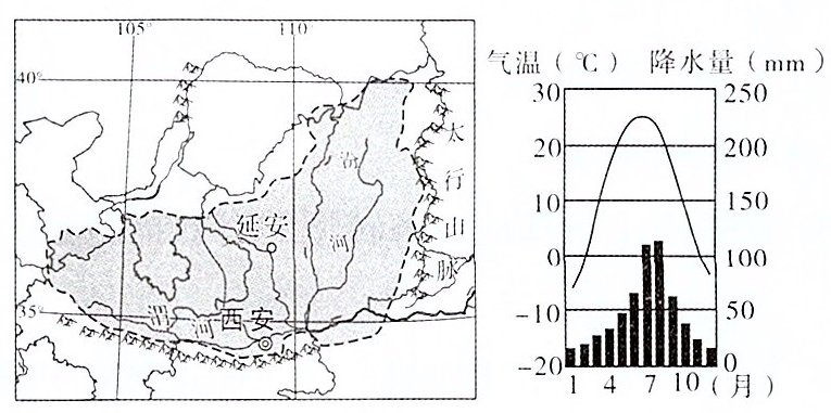 下面为黄土高原区域略图及延安气温曲线和降水量柱状图。读图,完成6~7题。