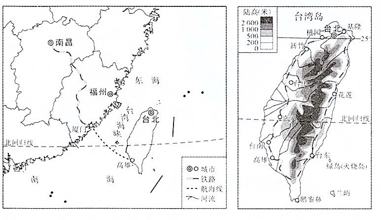 从江西至台湾的首趟铁海联运专列于2022年1月10日下午开通,列车所运货物将通过铁海联运模式直运台湾高雄、基隆等多个港口。下面为江西至台湾铁海联运示意图及台湾岛地形图。读图,完成4~6题。