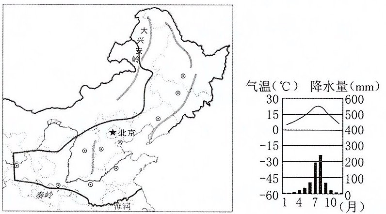 读北方地区的位置和范围图、北方地区多年平均气温和降水量图,完成4~6题。