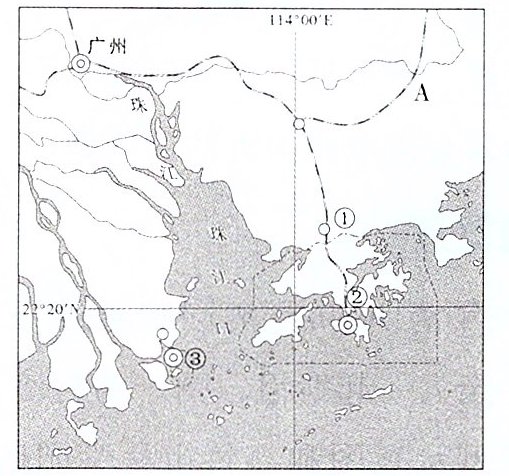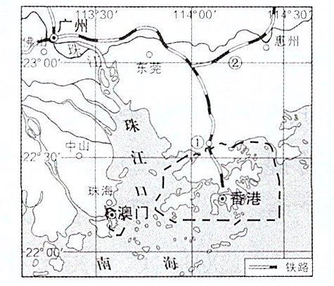 香港与祖国紧密相连,在中央政府的支持下,民生、经济等领域取得了亮眼的成绩。如图是珠江三角洲地区示意图。据此完成1~2题。