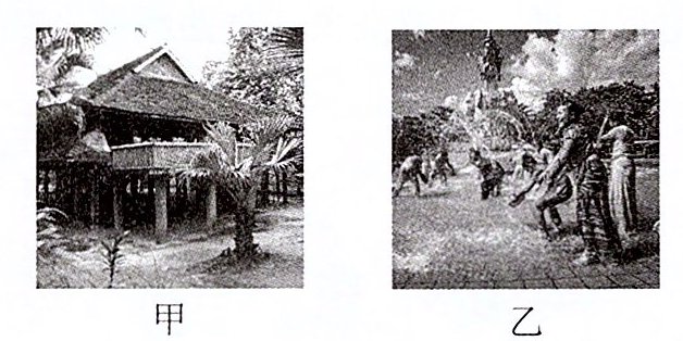2. 图甲中的建筑特点反映当地的气候特征是 ( )