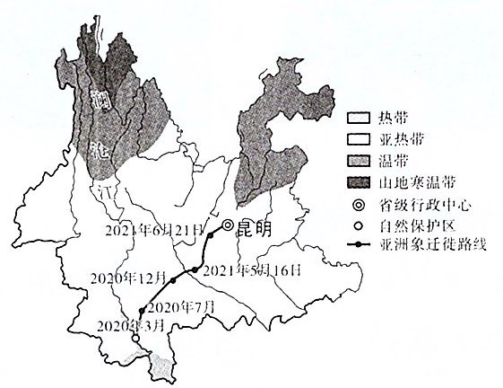 亚洲象主要分布在云南省南部热带地区,数量稀少。2020年3月,16头亚洲象从云南西双版纳自然保护区“离家出走”,一路北上到达昆明附近区域。读亚洲象迁徙路线图,完成6~7题。