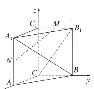 例 4 如图,在直三棱柱 ABC - A₁B₁C₁ 中,CA = CB = 1,$\angle BCA = 90^{\circ}$,AA₁ = 2,M,N 分别是 B₁C₁,A₁A 的中点。