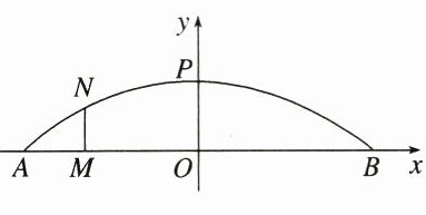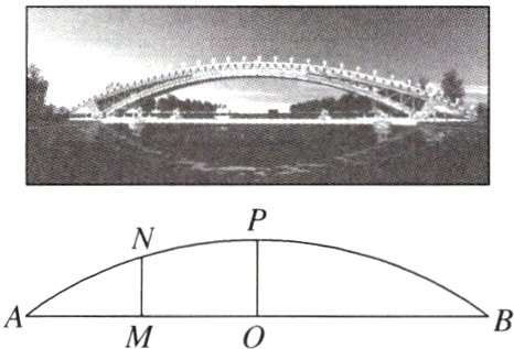 巩固练习 1 苏州有很多圆拱的悬索拱桥(如寒山桥),经测得某圆拱索桥(如图)的跨度|AB| = 100 米,拱高|OP| = 10 米,在建造圆拱桥时每隔 5 米需用一根支柱支撑,则与 OP 相距 30 米的支柱 MN 的高度是______米.(注意:$\sqrt{10}\approx3.162$)( )