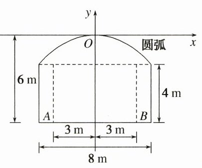 例 1 如图,一隧道内设双行线公路,其截面由一个长方形(长、宽分别为 8 m,4 m)和圆弧构成,截面总高度为 6 m,为保证安全,要求行驶车辆顶部(设为平顶)与隧道顶部在竖直方向上高度之差至少要有 0.5 米,已知行车道总宽度|AB| = 6 m.