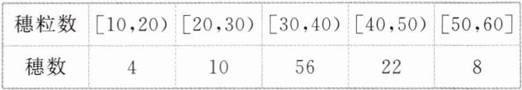 例4 单位面积穗数、穗粒数、千粒重是影响小麦产量的主要因素,某小麦品种培育基地在一块试验田种植了一个小麦新品种,收获时随机选取了100个小麦穗,对每个小麦穗上的小麦粒数进行统计得到如下统计表: