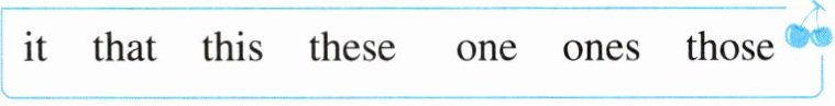1. one 【点拨】上一句“shirt”为单数名词且表示泛指,故下一句用one代指。2. ones 【点拨】上一句“pants”为复数名词,故下一句用ones代指。3. it 4. those 【点拨】由“over there”可知距离较远且前面are为复数,故用指示代词those。5. this