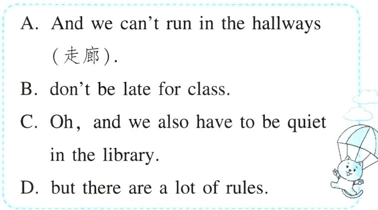 任务一:1. D 【点拨】由“This is a great school(这是一所很好的学校)”可知紧接着介绍学校中的其他事情,故选 D。