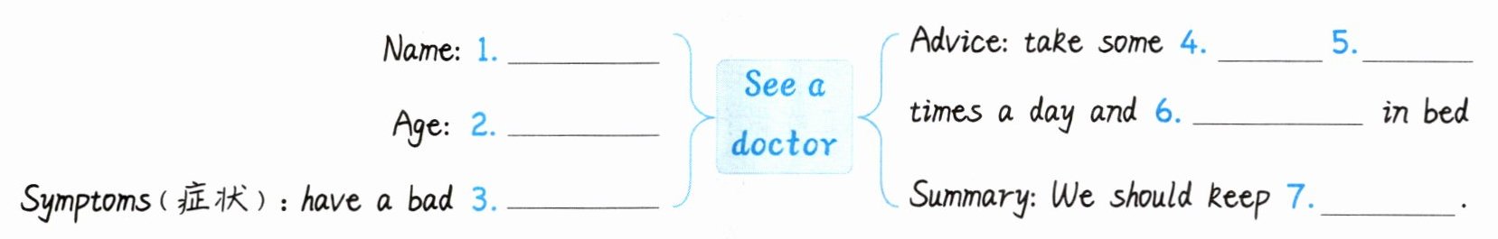 (一)1.Diandian 2.eleven/11 3.cold 4.medicine 5.three 6.stay 7.healthy(二)示例:1.I have a fever.2.I should take a good rest.